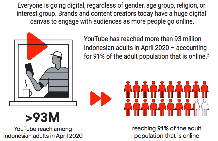 Ditambah lagi, Youtube bisa menjangkau 93 juta netizen di Indonesia di April tahun ini. Konten yang paling banyak ditonton bervariasi dari musik sampai kelas yoga. Di sisi lain, pandemi ternyata membawa berkah yang luar biasa untuk industri video seperti Youtube ini.