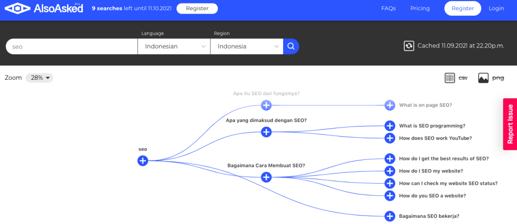 Mirip dengan Answer the public, salah satu search listening tools yang dapat memberi kita ide adalah tool ini. Tool ini sudah diupdate dan versi barunya support bahasa Indonesia. Kita mendapat ‘jatah’ 10 kali search keyword, sampai waktu yang ditentukan, setelahnya, kita harus register.