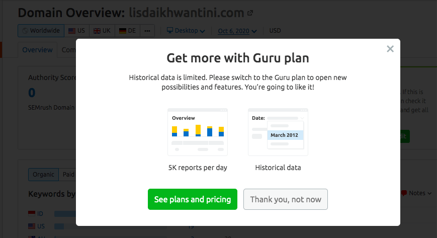 - Periode tidak bisa kita tentukan sendiri, karena historical data dibatasi, nanti ada pop up yang membuat kita harus membeli plan dari SEMrush.