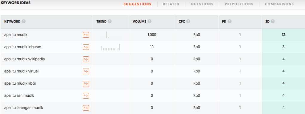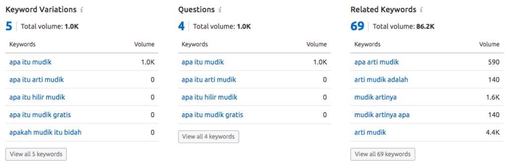Kedua tools ini, memberikan volume search yang relatif sama. Menurut SEMrush dan Ubersuggest ‘apa itu mudik’ volume searchnya 1K. Saya sedang tidak menjalankan Google ads, jadi tidak tahu angka pasti untuk ‘apa itu mudik’ dari keyword plannernya Google, saya rasa angkanya kurang lebih sama. Secara trend juga mirip. SEMrush memberikan beberapa related keyword seperti ‘apa arti mudik’, ‘arti mudik adalah’ atau ‘mudik artinya’. Selainkeyword yang berhubungan dengan larangan mudik 2021 atau penyekatan mudik 2021, masih ada netizen +62 yang penasaran justru kepada kata ‘mudik’ itu sendiri.