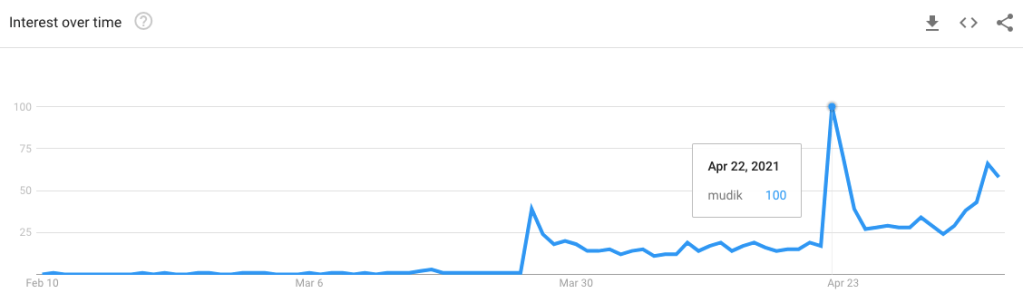Di 21 April, trend ‘mudik’ meningkat pesat. Hal ini bisa jadi karena ketatnya larangan mudik 2021 yang dikeluarkan pemerintah. Trend ‘mudik’ juga meningkat di 6 Mei 2021, sepertinya sampai akhir bulan Mei akan terus meningkat.